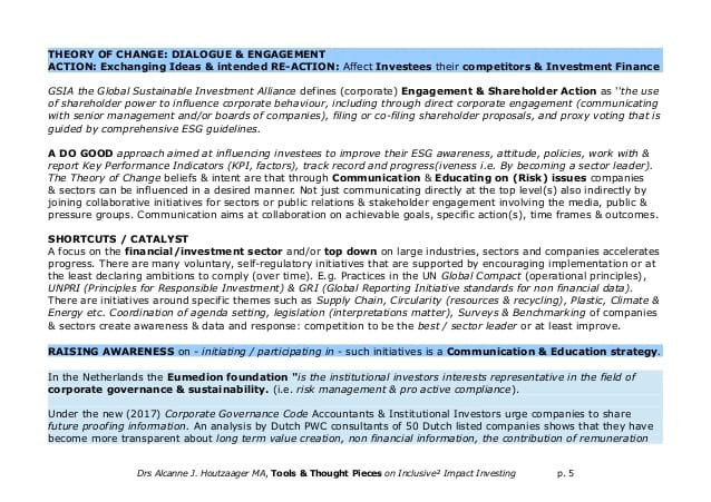 THEORIES OF CHANGE are like INVESTMENT MANDATES: guiding principles to achieve the impact goals.'Balancing impact & return' mandates -the preferred strategy for large impact investors (theGIIN Global Annual Surveys) can be exclusion guidelines and/or allocation to low(er) ESG (Environment, Social & Governance) Risk Exposure and / or Selection of ESG Opportunities, Best-in-Class investments and SDG & (Deep) Impact Investments.
